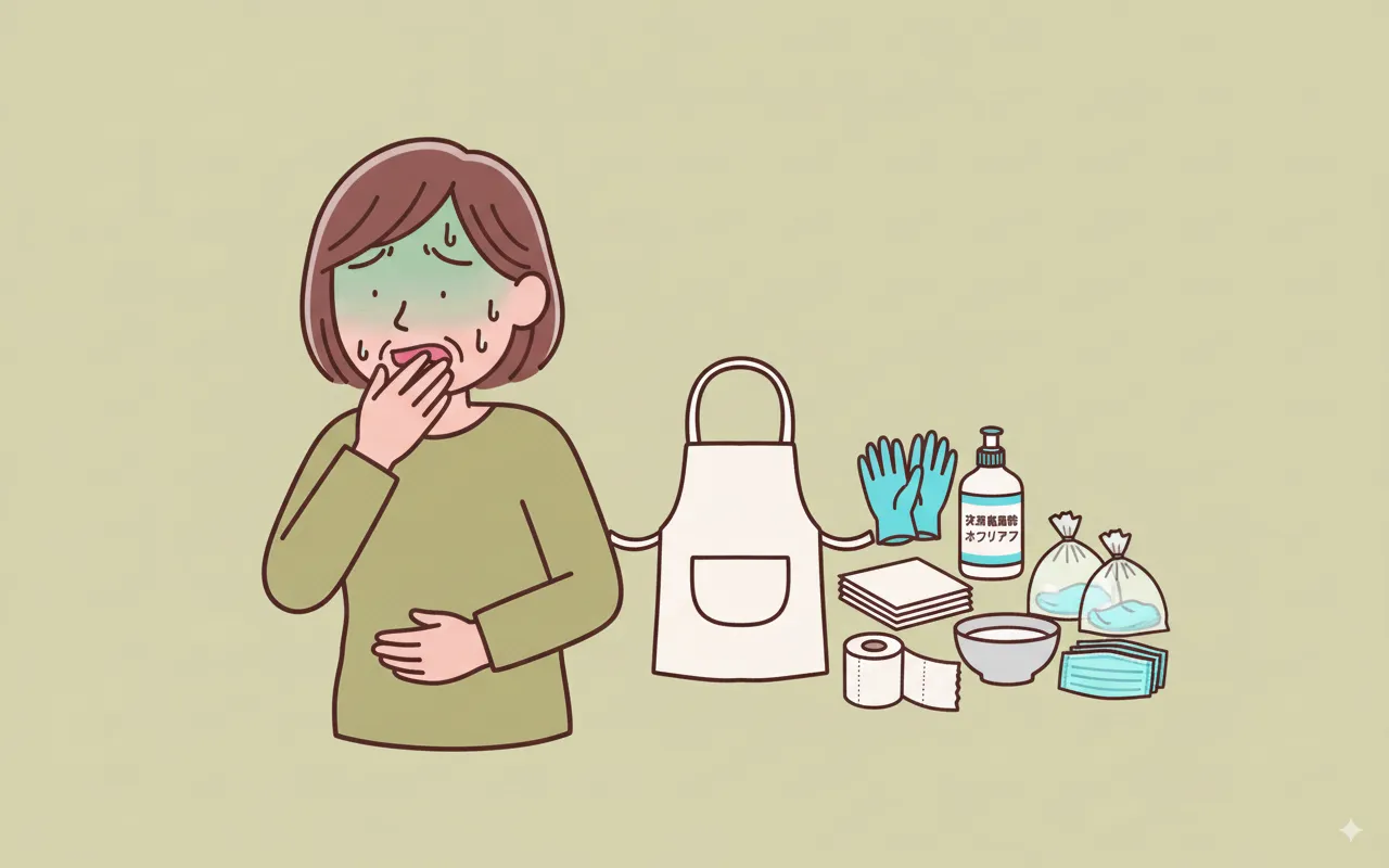 あらかじめ、**使い捨てのマスク、手袋、エプロン、ペーパータオル、次亜塩素酸ナトリウム、ビニール袋などをまとめた「嘔吐物処理キット」**を準備しておきましょう。
