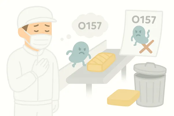 ある工場では、従業員1名が無症状でO157を保菌。ふきとり検査でラインからO157が検出され、製品はすべて廃棄に。「検便さえしていれば…」経営陣が深く後悔した事故でした。